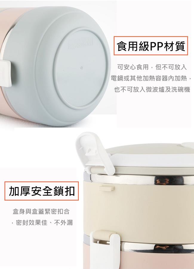 商品特色 1.上層有防漏矽膠圈,避免湯汁漏出 2.密封性佳,保溫、保鮮、保冷效果好 3.安全的鎖扣設計與雙層的空間容量, 讓您上層可裝湯、下層可裝飯、菜, 湯分開不混裝,不影響食物美味。